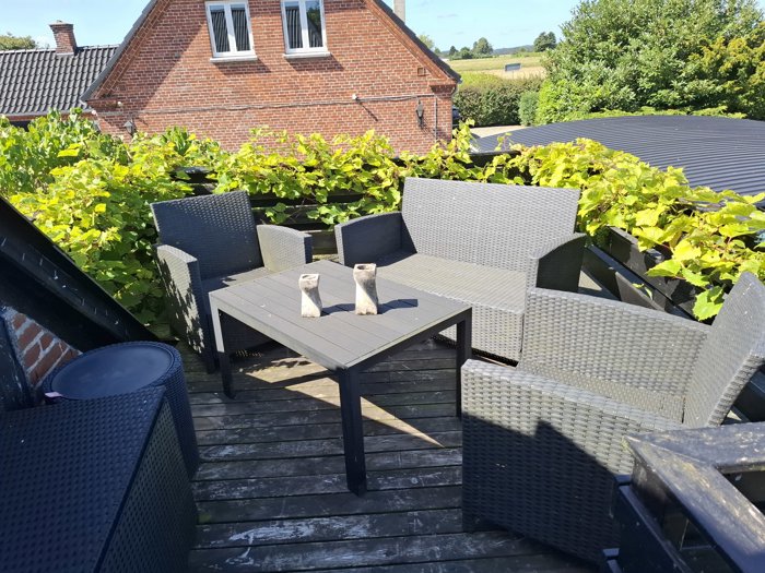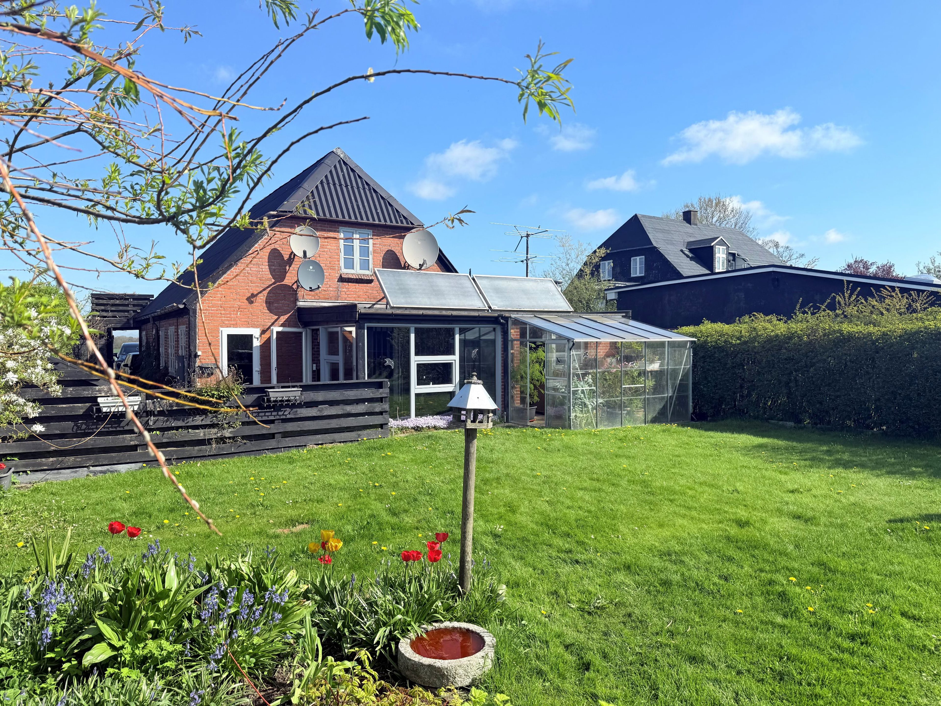 Haven er en sand oase med velanlagte blomsterbede, en grøn græsplæne og et frostfrit drivhus, der giver mulighed for vinteropbevaring af planter og blomster. To skønne terrasser inviterer til udendørs ophold og hyggelige stunder med familie og venner i de varme måneder.