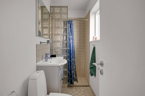 Fra husets entre er der adgang til nydeligt badeværelse med brus og tidsløse klinker.