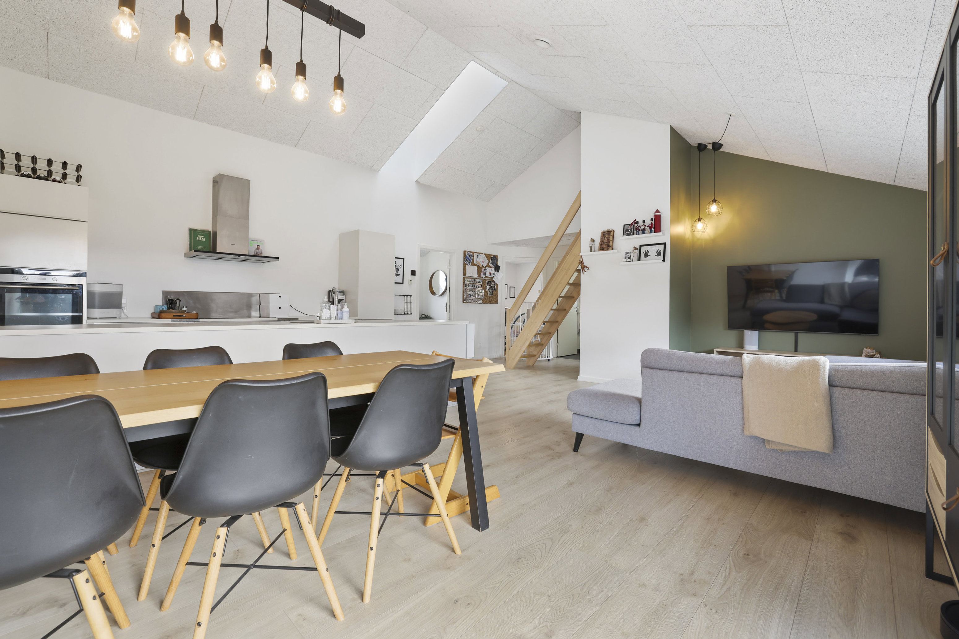 Husets hjerte er det åbne og lyse køkken/alrum. Det moderne køkken er designet med fokus på funktionalitet og æstetik, og her finder du integrerede Siemens-hvidevarer, der gør madlavningen til en fornøjelse. Den åbne forbindelse mellem køkken og opholdsstue skaber en moderne og rummelig fornemmelse, hvor I kan samles på tværs af aktiviteter. Stuen er ideel til både afslapning og samvær med gæster, og de store vinduer giver et fantastisk lysindfald og en smuk udsigt til den grønne have.