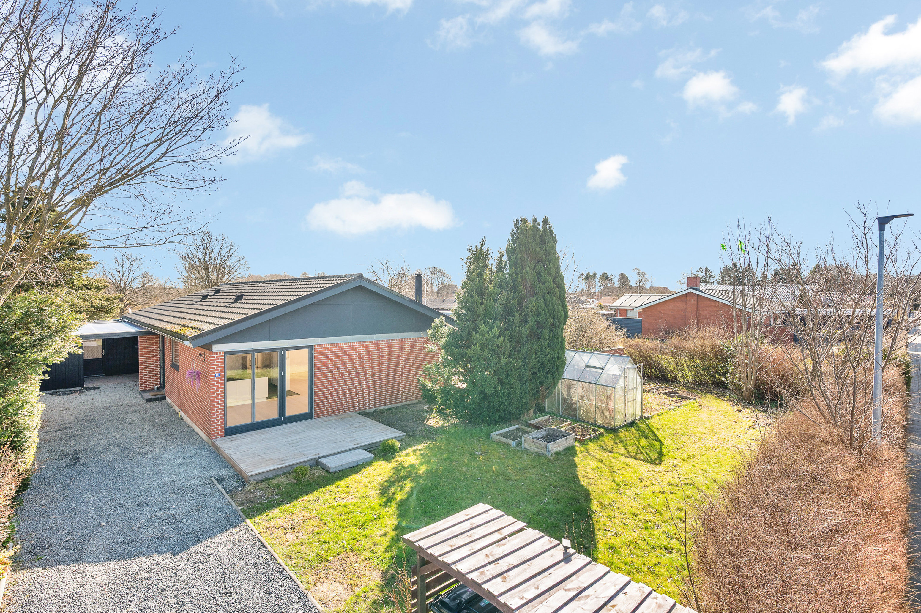 Til boligen hører en praktisk carport med direkte adgang til et godt og funktionelt bryggers med plads til både vaskemaskine og tørretumbler – en løsning, der gør hverdagen nem og bekvem.