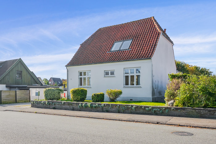 Boligen fremstår med pudset facade og klassiske dannebrogsvinduer, og planløsningen danner gode rammer for det moderne familieliv. Stueetagen byder på et funktionelt køkken samt to stuer, hvor den ene rummer både spiseplads og opholdsstue med god plads til samvær og gæster. Fra den anden stue er der adgang til førstesalen via trappe.