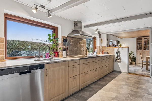 Indenfor bydes du velkommen i en gæsteentre med gulvvarme, der fører videre til et stort og indbydende badeværelse med både spa, bruseniche og gulvvarme. Herfra træder du ind i hjemmets naturlige samlingspunkt: et stort lyst køkken med fritlagte bjælker, der skaber en varm, landlig atmosfære. Køkkenet ligger i åben forbindelse med den rummelige spisestue, hvor hele familien kan samles om måltider og hyggestunder. Videre herfra ligger opholdsstuen, der ligeledes er i åben forbindelse. Fra køkkenet er der desuden adgang til et godt bryggers med vaskefaciliteter, vask og masser af skabsplads.