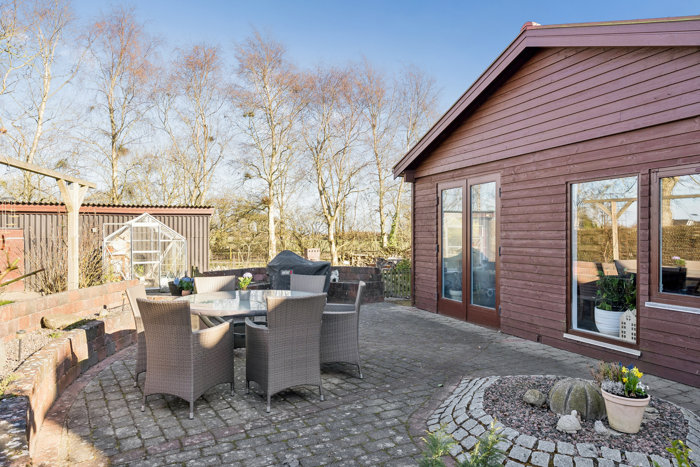 Grunden er smukt indrettet med flere hyggelige terrassemiljøer, hvor du kan finde sol, læ eller skygge dagen igennem. Et bålsted, en charmerende urtehave og små kroge rundt om i haven skaber en stemning af fred, nærvær og landlig idyl – alt sammen uden at skulle gå på kompromis med funktionalitet.