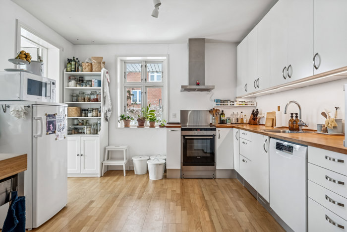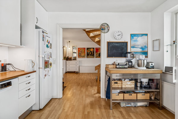 Indenfor mødes I af en varm og indbydende atmosfære. Køkkenet fremstår lyst og funktionelt med god bordplads, hvide elementer og træbordplade, som giver et naturligt og nordisk udtryk. Her er plads til at kokkerere og være sammen – og fra vinduet har man udsigt til haven.
