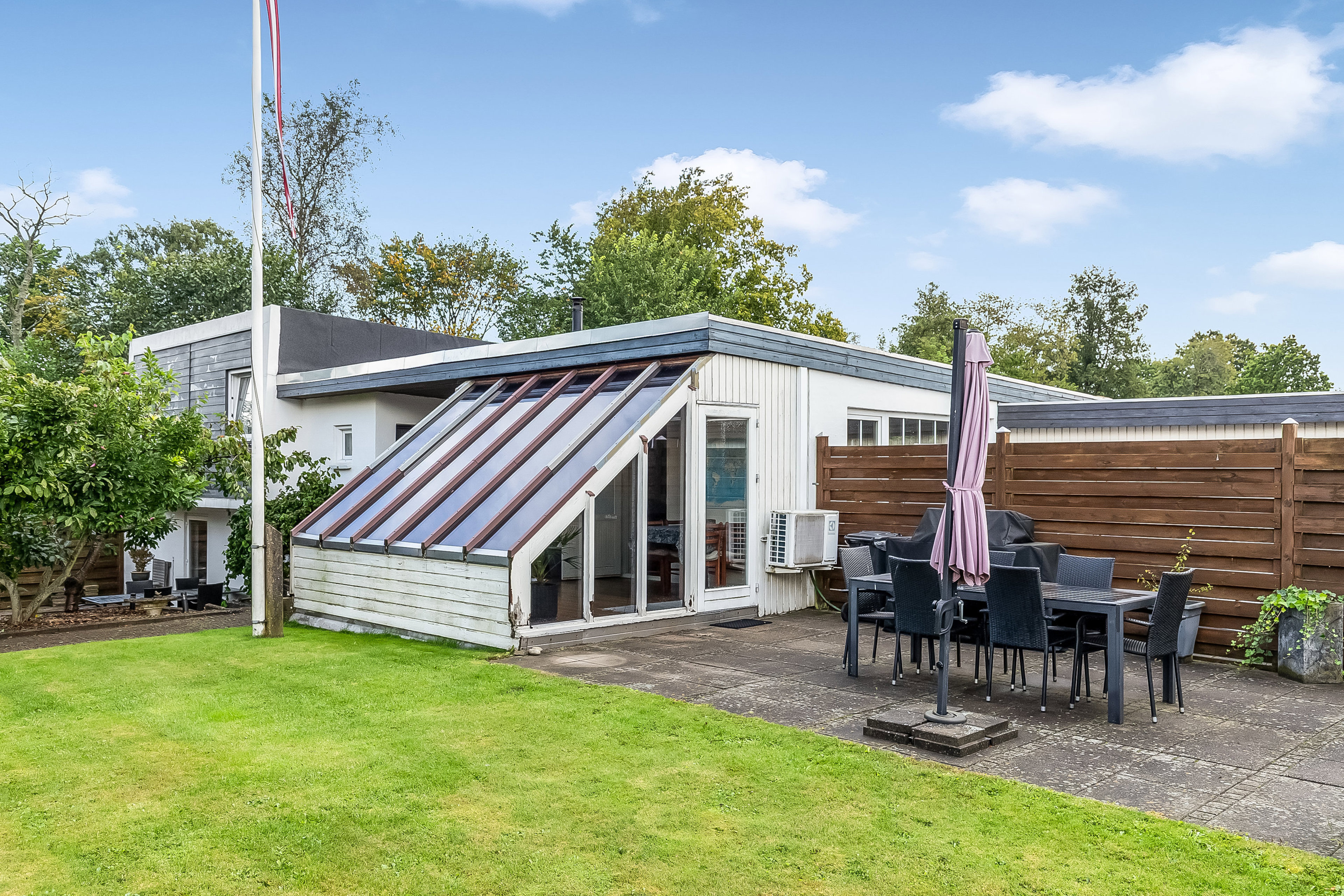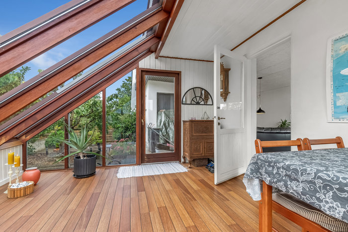 Udefra fremstår villaen indbydende med sin hvide facade. Fra gadesiden er der adgang til garagen samt et ekstra flisebelagt område. Baghaven byder på nem og overskuelig have med flere solrige terrasseområder, hvor der er gode muligheder for både afslapning, udeliv og leg. Taget er udskiftet i ca. 2022. Træpilleovn er fra 2018 og vinduerne er løbende udskiftet.