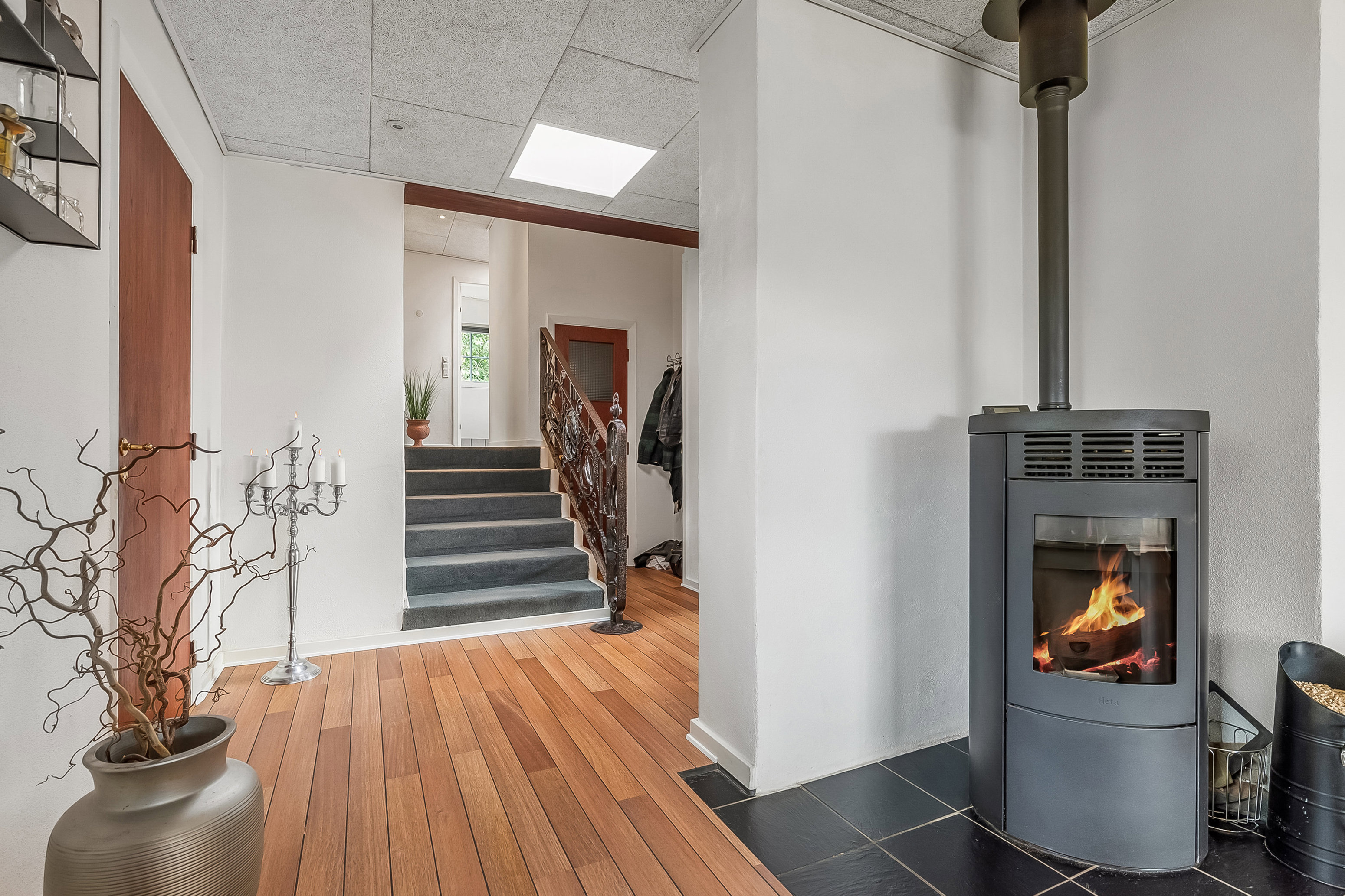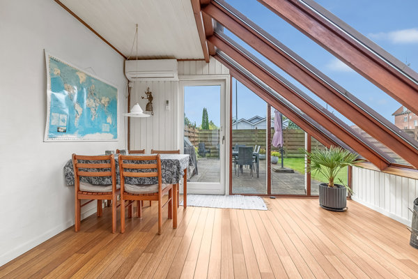 Boligens kernerum er den hyggelige stue, hvor en pillebrændeovnen skaber hygger. Her er god plads til både sofaarrangement og spisebord, så familie og gæster kan samles. Køkkenet er rummeligt og indrettet med træfronter samt god skabs- og skuffeplads.