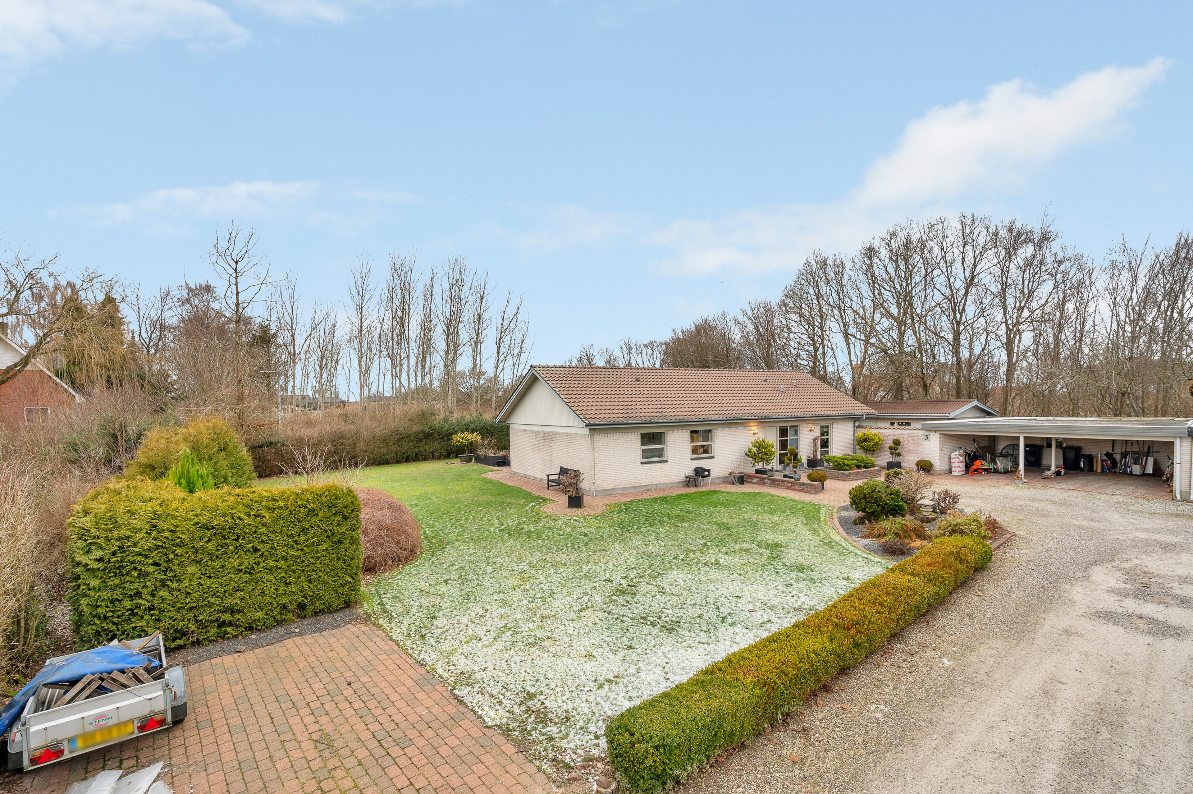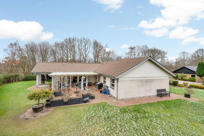 Det meste af haven vender mod syd for masser af sol på terrasserne i husets vinkel. På den anden side får du en stor, grusbelagt indkørsel foran den dobbelte carport med redskabsrum. En gårdhave forbinder carporten og værkstedet, hvor der er plads til lidt af hvert – motorcykel, håndværksaktiviteter, slyngelstue og meget andet.