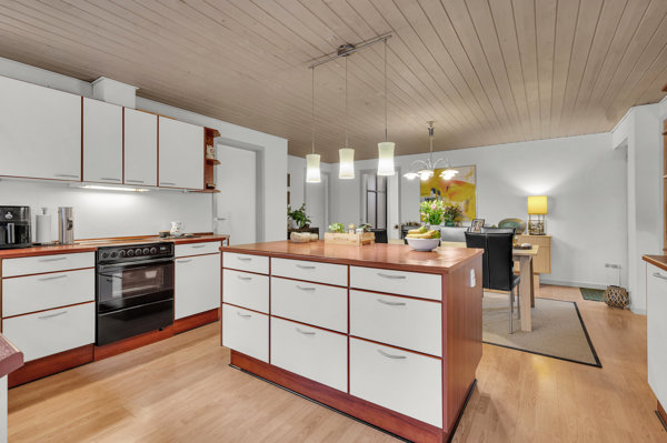 Ejendommen har gennemgået flere løbende opdateringer og fremstår således pæn, lys og velholdt. Mange af boligens kvadratmeter er dedikeret til opholdsområde med et funktionelt køkken-alrum i forbindelse med en rummelig opholdsstue og en nedsænket stue, der tidligere var pejsestue. Fra opholdsrummene er der tilmed direkte udgang til en overdækket terrasse, der forlænger udesæsonen.