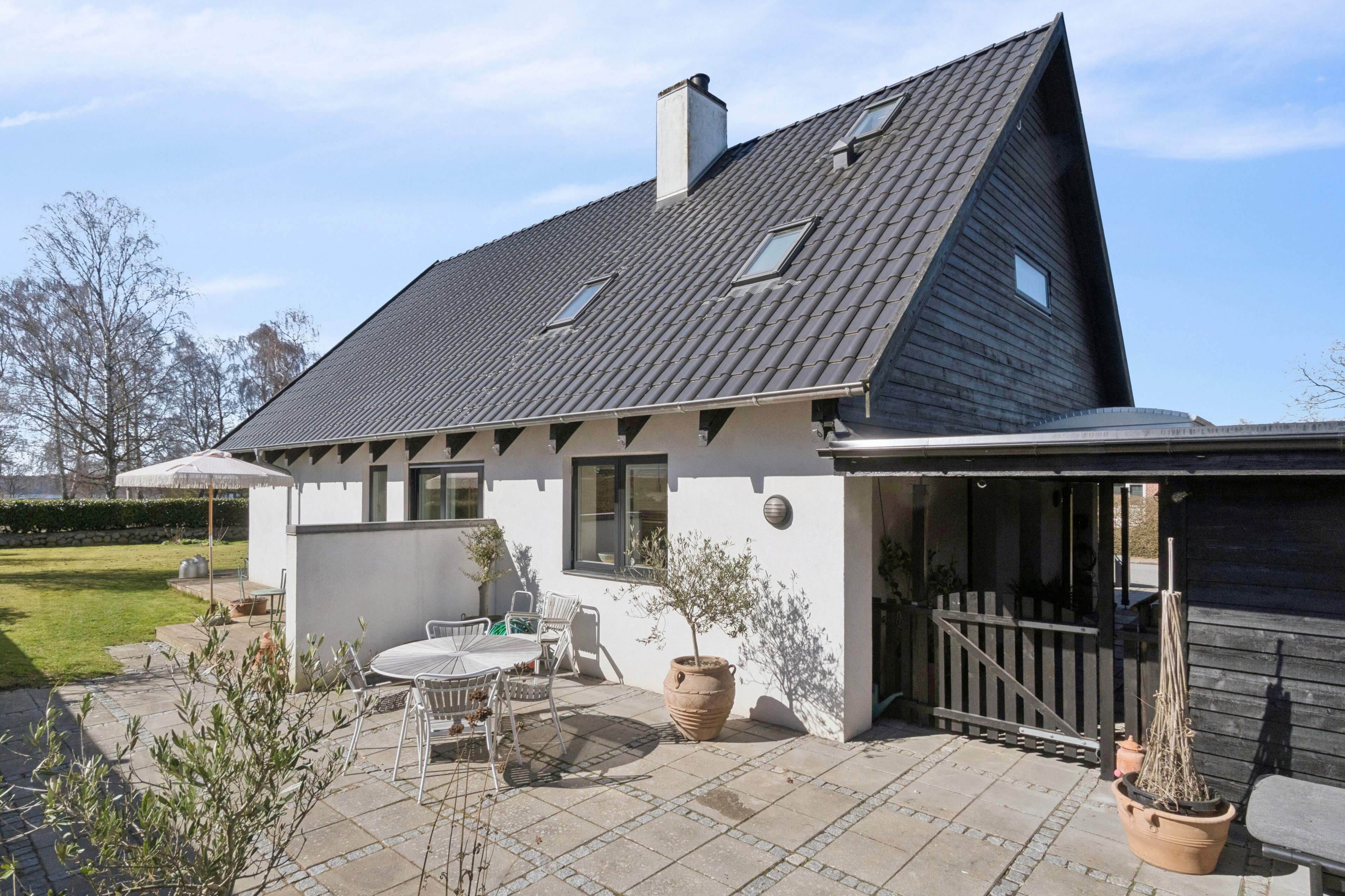 Haven er et kapitel for sig. En idyllisk oase der skaber en stemning af ro og sommerliv. Her er flere hyggelige lækroge, og solen kan nydes fra morgen til aften. Fra alle rum er der direkte udgang til terrassen, hvilket skaber en unik sammenhæng mellem inde- og udeliv.
