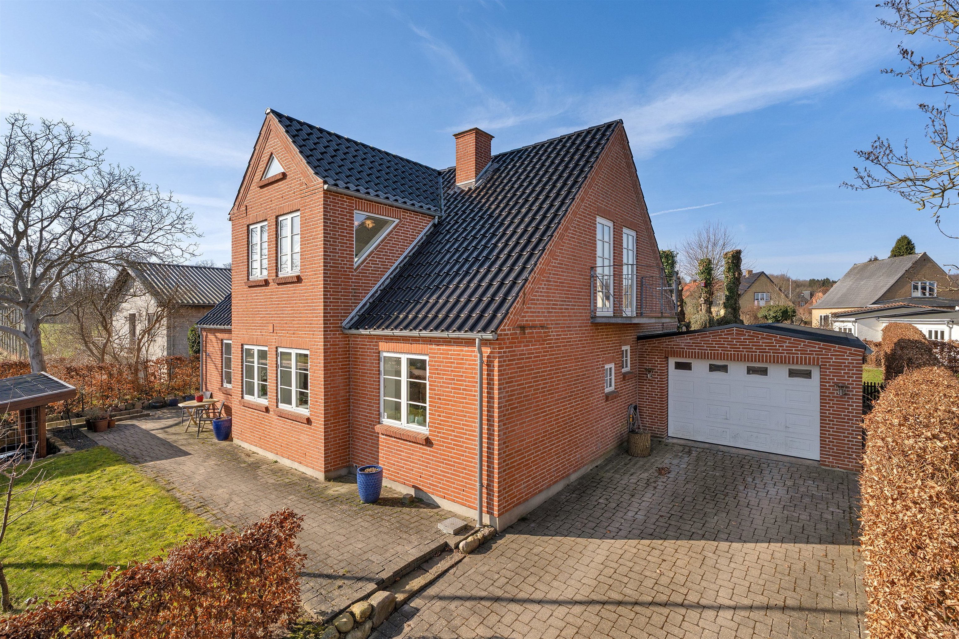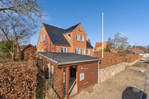 Til ejendommen hører en integreret garage med automatisk port samt et praktisk depotrum og dør til haven. Derudover et brændeskur og et haveskur, som giver gode muligheder for opbevaring. Haven er anlagt med græs og enkelte buske samt flotte træer, der står centralt i haven og giver en fin og stemningsfuld ramme om uderummet. Her er god plads til leg, afslapning og hyggelige stunder på terrassen, hvor sommerdagene kan nydes i rolige omgivelser.