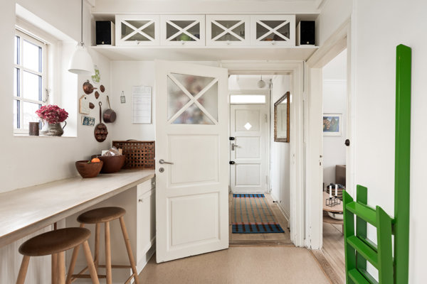 Dertil kommer charmerende detaljer som stuk og loftsrosetter, der understreger boligens karakter.