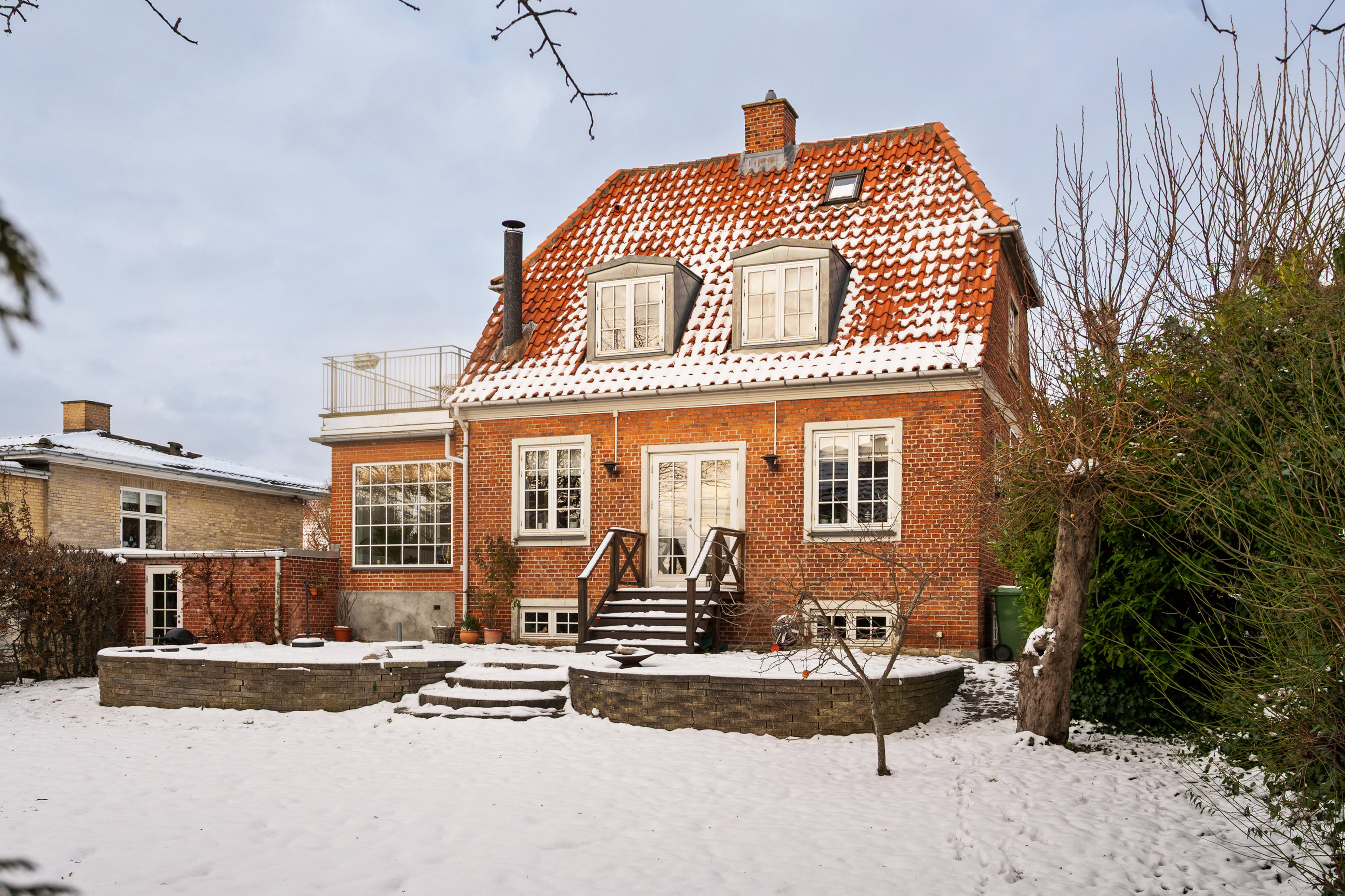 Villaen er opført i 1930 og fremstår med rødt mansardtag, røde mursten og sprossede vinduer – klassiske detaljer, der skaber et harmonisk og indbydende udtryk.