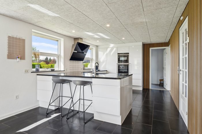 Boligens hjerte er det lyse og stilrene køkken-alrum, der blev etableret i 2010 og stadig fremstår topmoderne. Her er masser af skabsplads, flotte sorte granitbordplader og en naturlig forbindelse til spise- og opholdsstuen, hvor en brændeovn spreder både varme og hygge. De store vinduespartier sikrer et dejligt lysindfald og fin udsigt til haven.