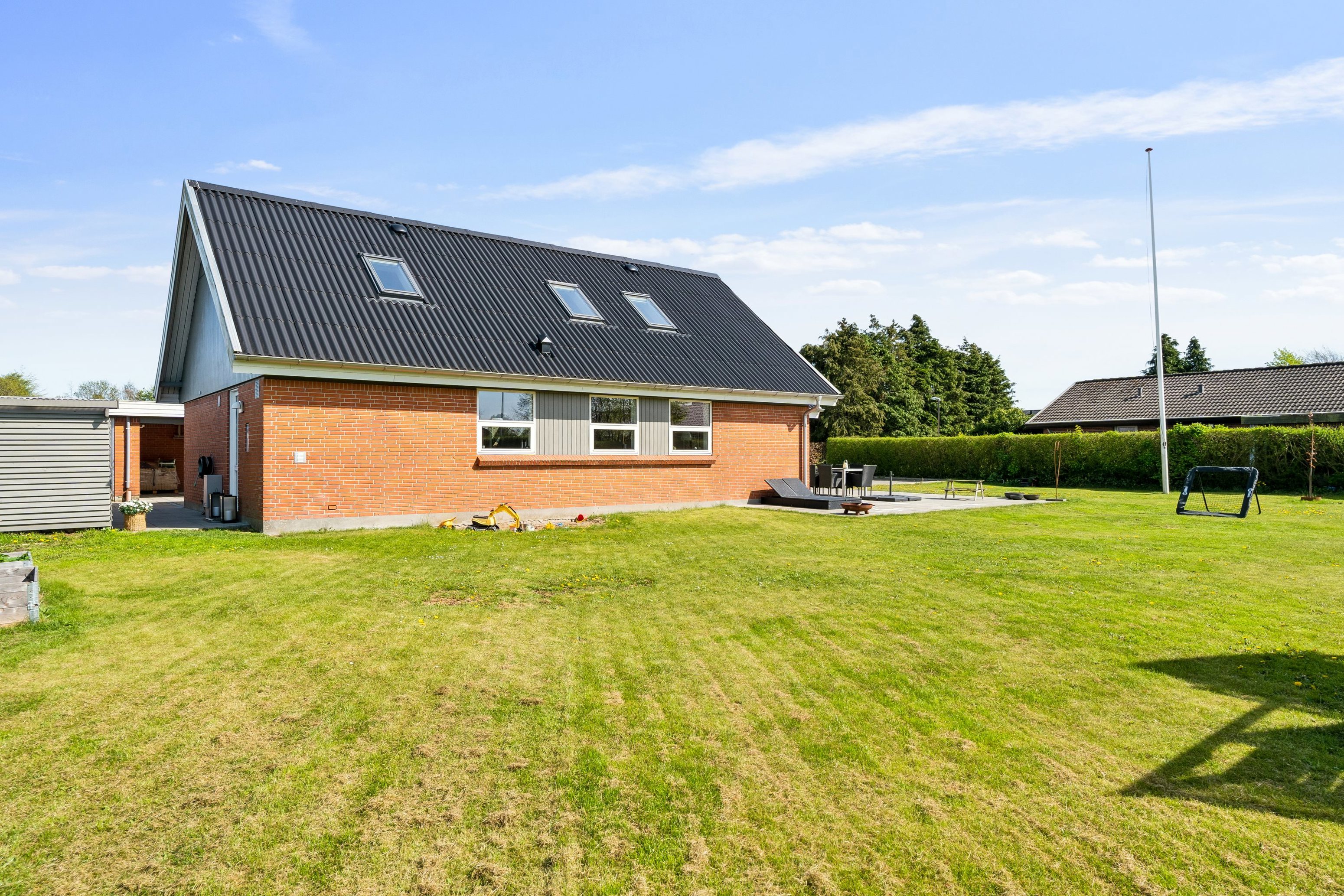 Her får I hele 190 veludnyttede boligkvadratmeter, fordelt med 120 m² i stueplan og 70 m² på første sal. Huset ligger på en stor grund på 1.110 m², som indbyder til leg, hygge og afslapning – med både stor terrasse, græsplæne og overdækket carport.