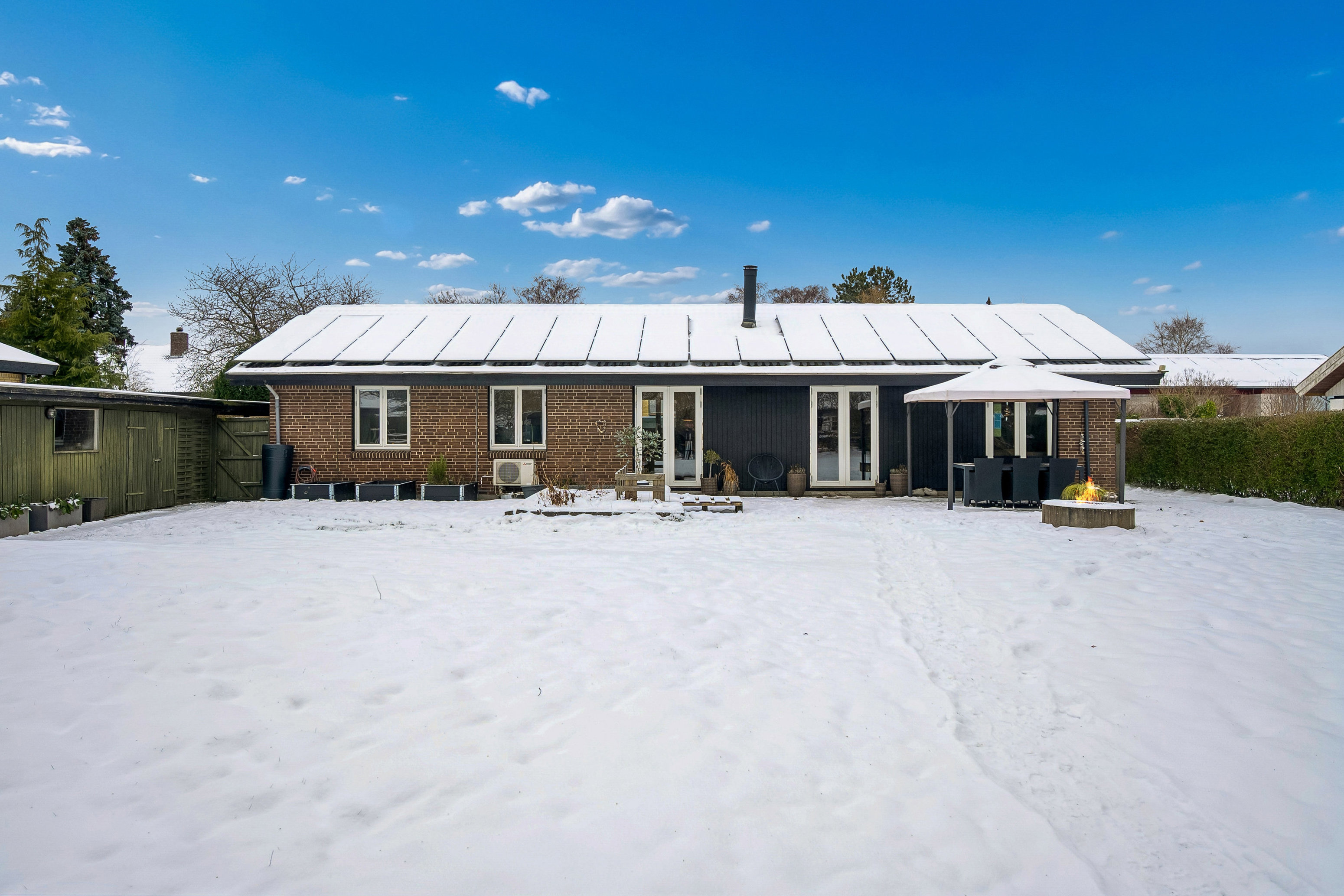 Udenfor venter en stor have med masser af plads til leg, boldspil og afslapning. Her er gode muligheder for at indrette flere hyggelige opholdszoner, og indkørslen giver gode parkeringsforhold. Ejendommen er desuden forbedret med både solcelleanlæg og elbillader samt installeret fibernet, som bidrager til en mere moderne og fremtidssikret hverdag.