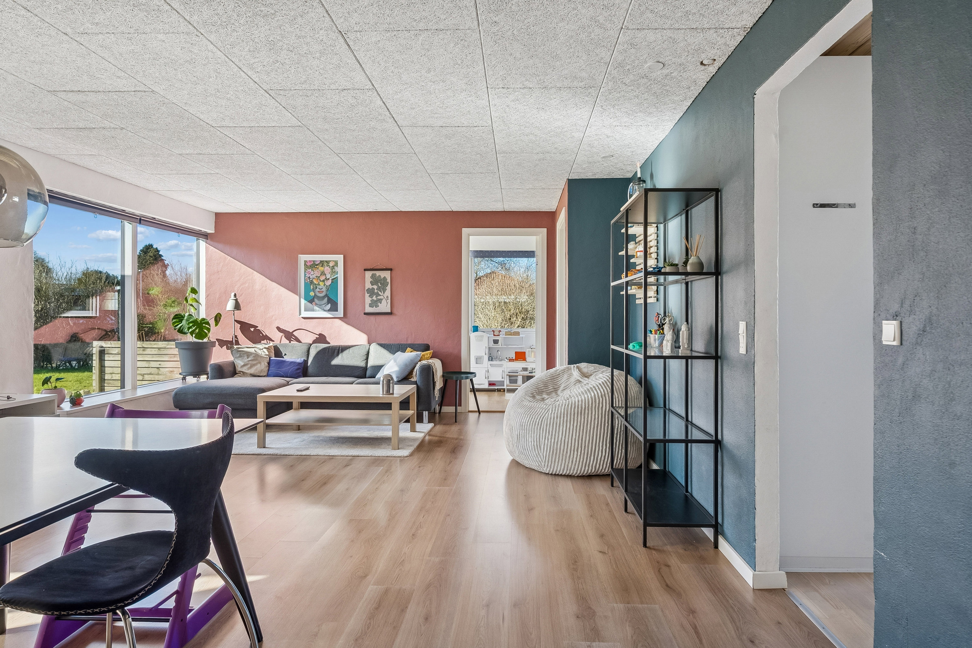 Husets naturlige samlingspunkt er den rummelige stue, hvor store vinduespartier sørger for et dejligt lysindfald og skaber en behagelig atmosfære gennem hele dagen. Her er god plads til både sofaarrangement og spiseafdeling, og rummet indbyder til hyggelige hverdage såvel som gæstebesøg. Fra stuen er der direkte udgang til en overdækket terrasse, som fungerer som en naturlig forlængelse af opholdsrummet i sommerhalvåret. Her kan I nyde morgenkaffen i rolige omgivelser eller samle familie og venner til grillmiddage med udsigt til haven.