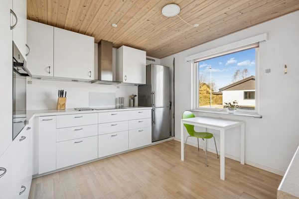 Køkkenet ligger centralt placeret i boligen og har en god størrelse med mulighed for spiseplads. I forlængelse af køkkenet ligger et funktionelt bryggers med egen indgang.