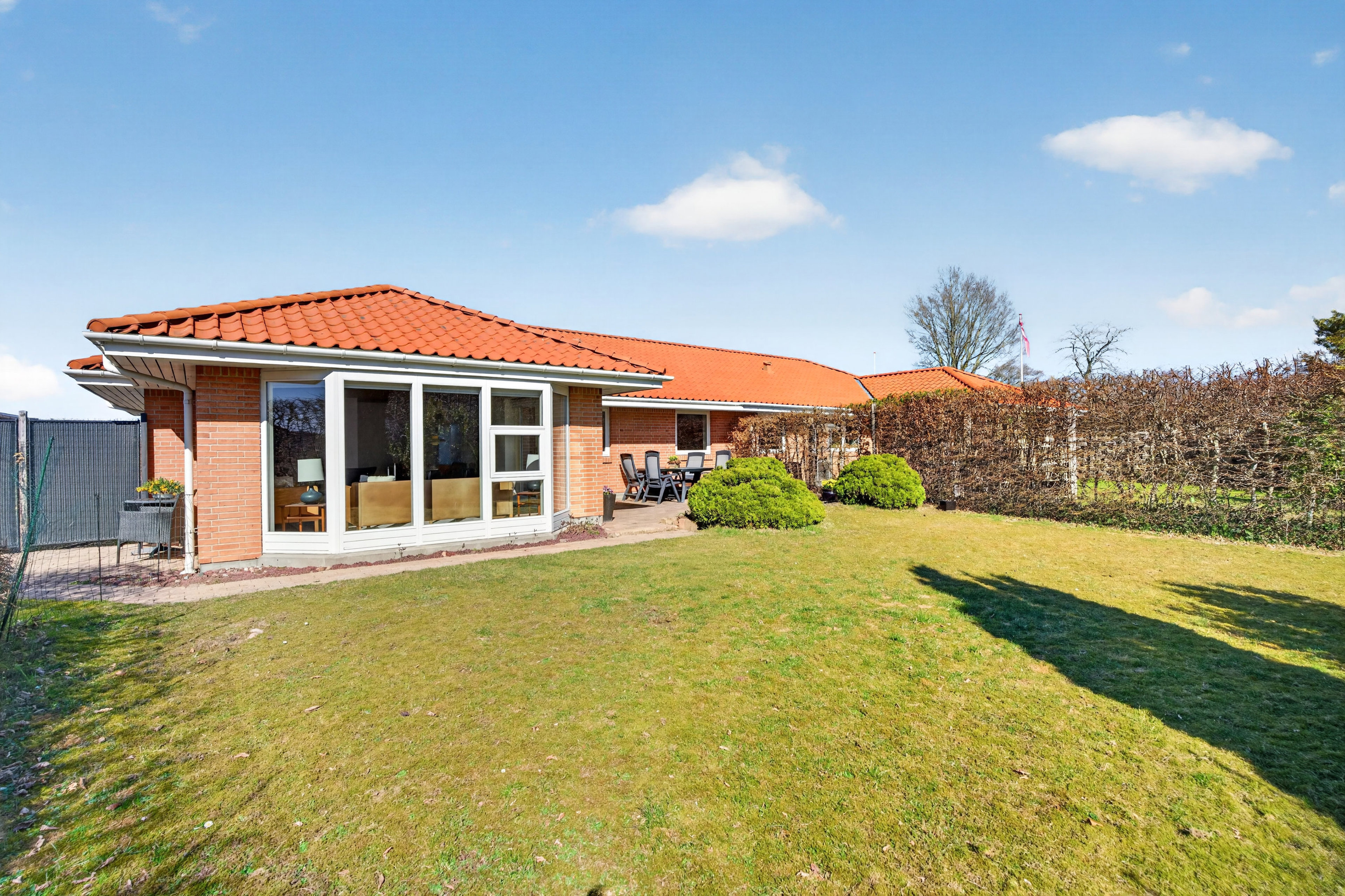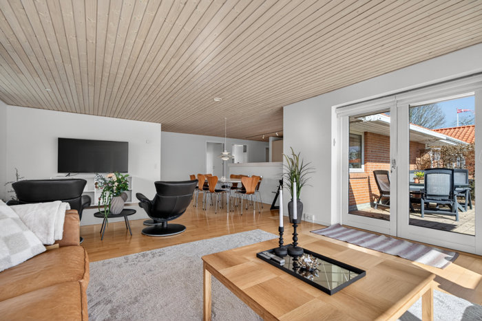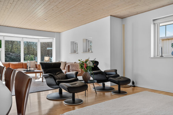 Blandt andet får I tre gode værelser og to badeværelser, hvoraf det ene baderum ligger i forlængelse af husets største værelse. Man har ligeledes fundet plads til et godt bryggers og en pæn entré, og i praktisk regi orienterer størstedelen af boligens rum sig mod den lyse opholdsafdeling. Det skaber en naturlig sammenhængskraft i hjemmet, som med køkken, spisestue og dagligstue i åbent rumforløb giver en fuldkommen tidssvarende indretning.