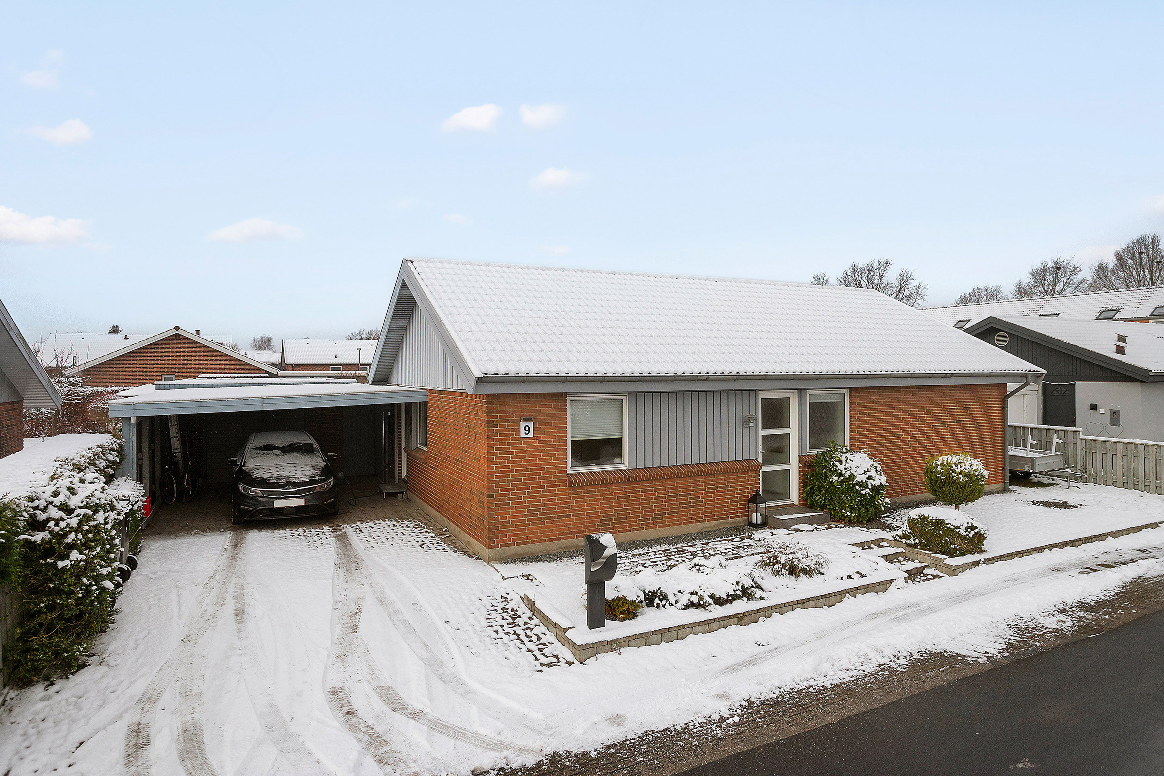I får desuden en garage, som er velegnet til hobbyværksted og med plads til at hænge cyklerne op, ligesom I får rig mulighed for at pusle knallerter og motorcykler. Foran garagen er der en carport, hvor bilen kan stå tørt og godt.