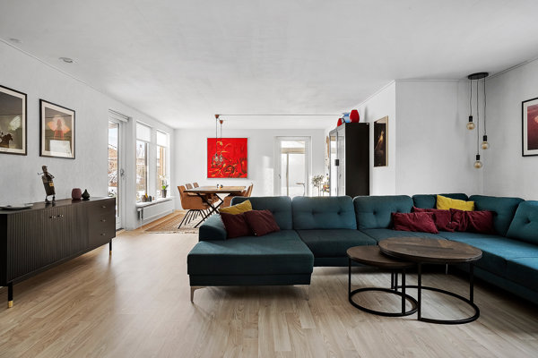 Den sydvendte stue er behageligt lys og med plads til, at I kan indrette jer med flere møbelgrupper. Fra stuen er der dør direkte til køkkenet til den ene side, og til den anden side fortsætter opholdsarealet i udestuen, som er forsynet med radiator, hvilket betyder at udestuen reelt fungerer som et ekstra opholdsrum. Fra udestuen er der skydedøre ud til to sider, så I vil opleve en god forbindelse mellem inde og ude.