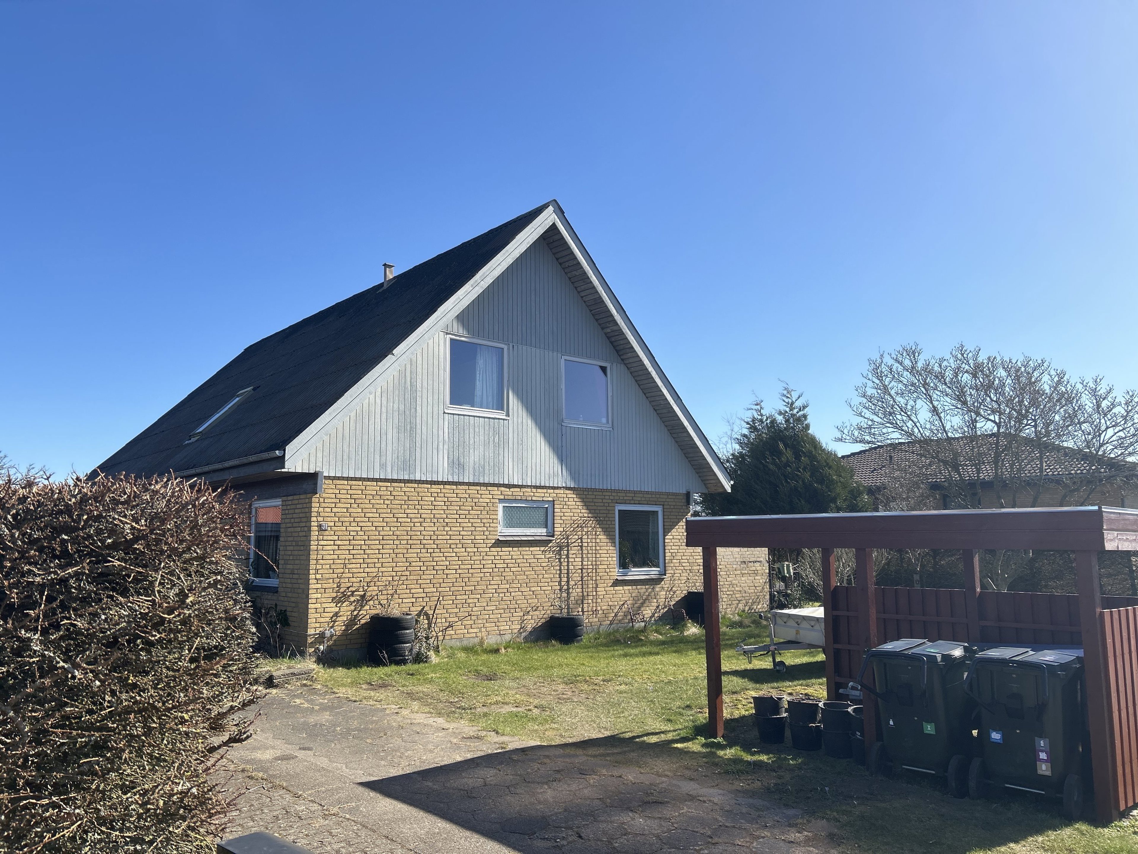 Huset fremstår velholdt. Taget er netop renset og alge-behandlet. Vinduer og døre er løbende skiftet, det store vinduesparti i stuen er fra 2019.