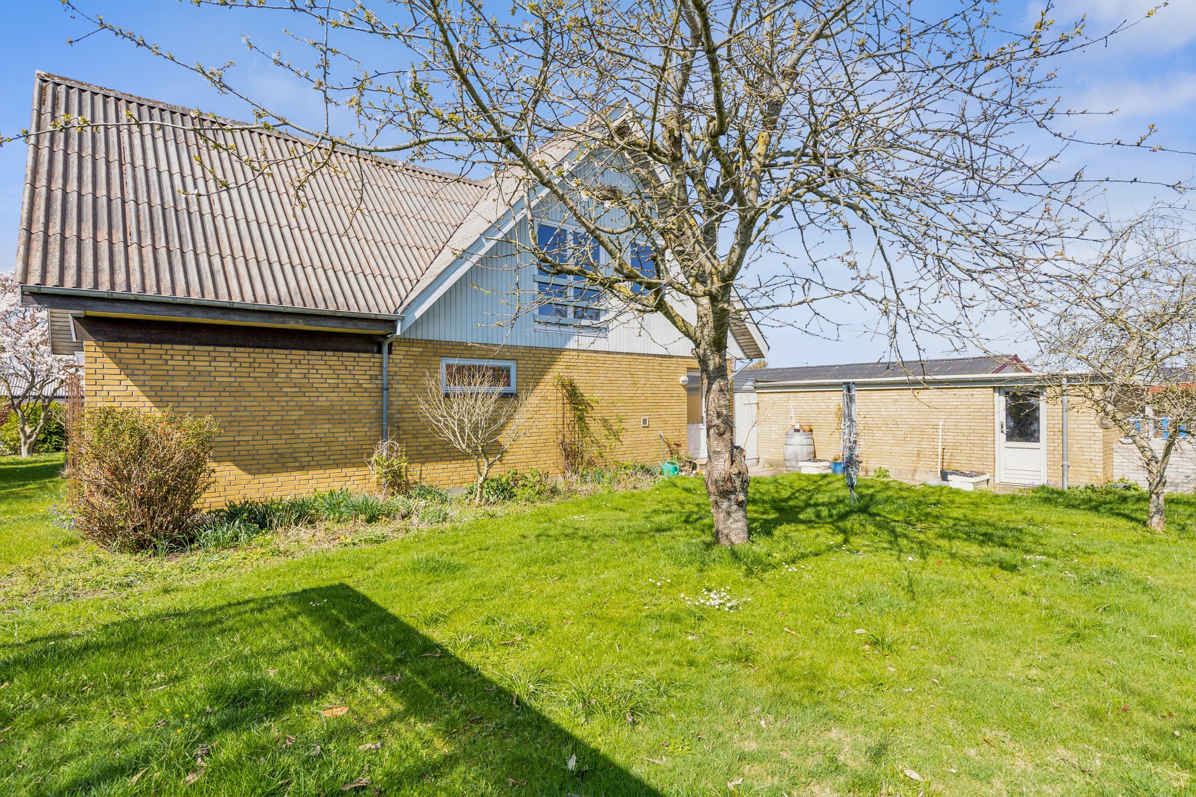 Haven er ugeneret, hovedsagelig udlagt i græs, der er plads til leg og boldspil. Flisebelagt indkørsel til garagen.