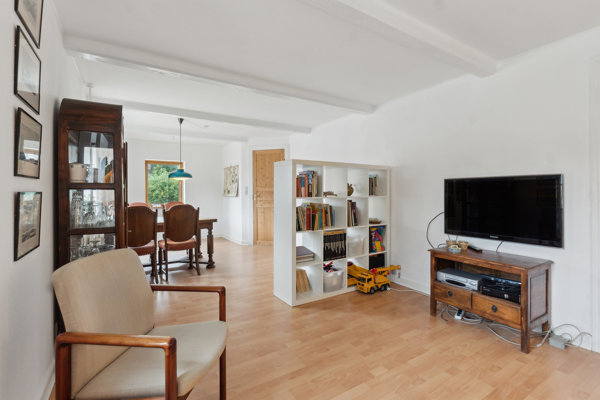 Inden døre fremtræder villaen lys og venlig, og i flere rum er der synlige, hvidmalede loftsbjælker, som føjer charme til boligen.