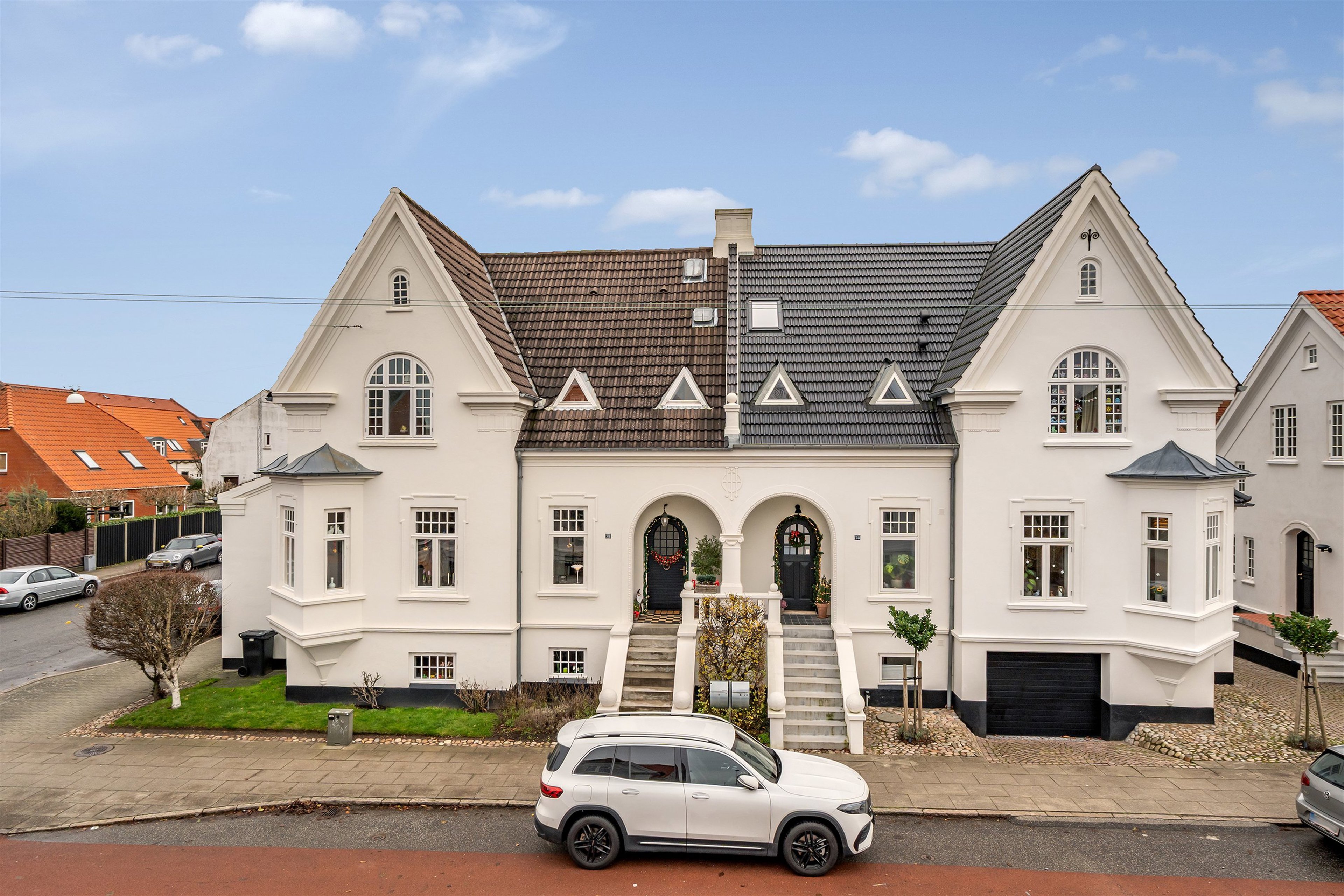 Allerede når man kører ned ad gaden, hvor de smukke hvide palævillaer ligger som perler på en snor, fornemmer man, at her er tale om en ganske særlig bolig.