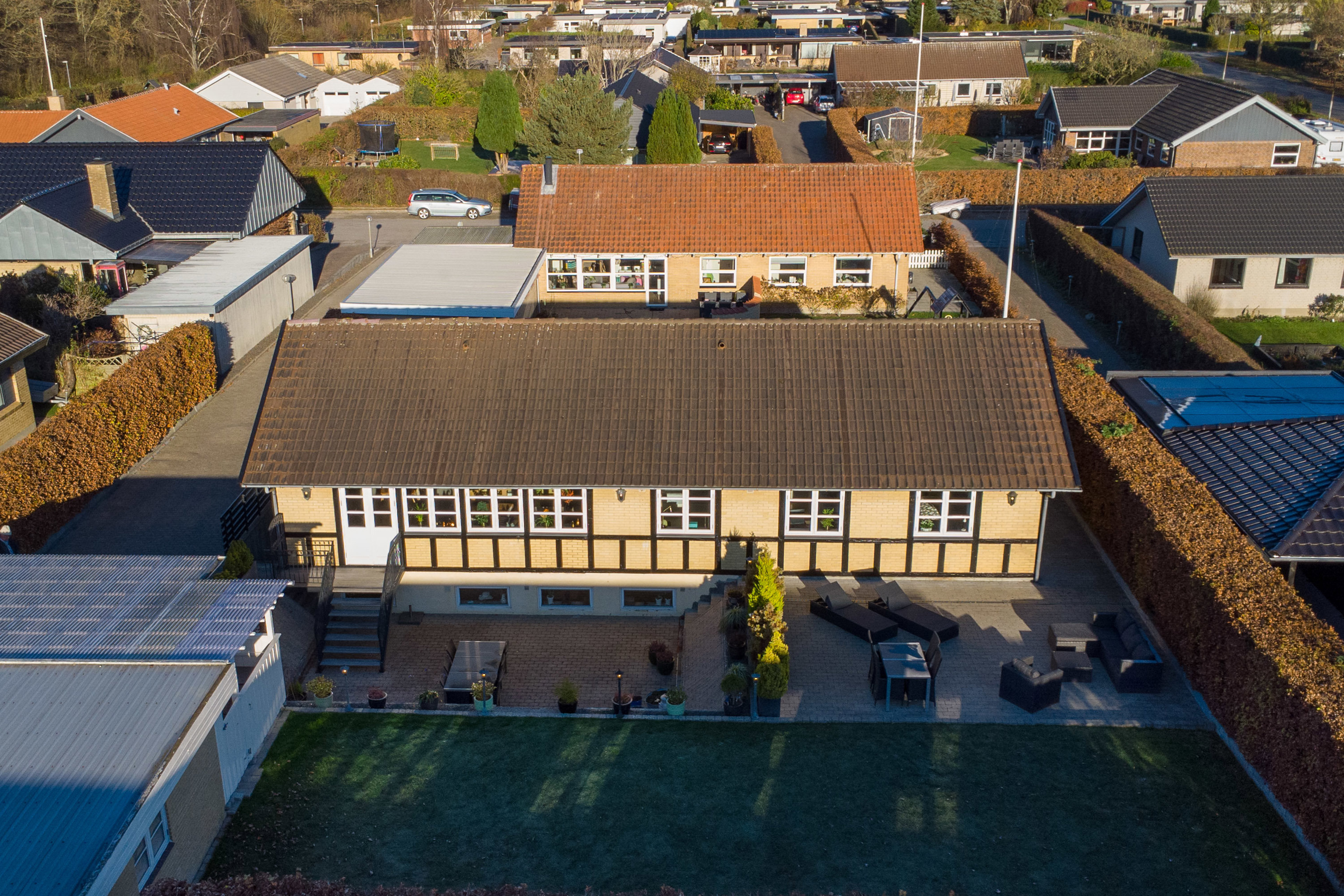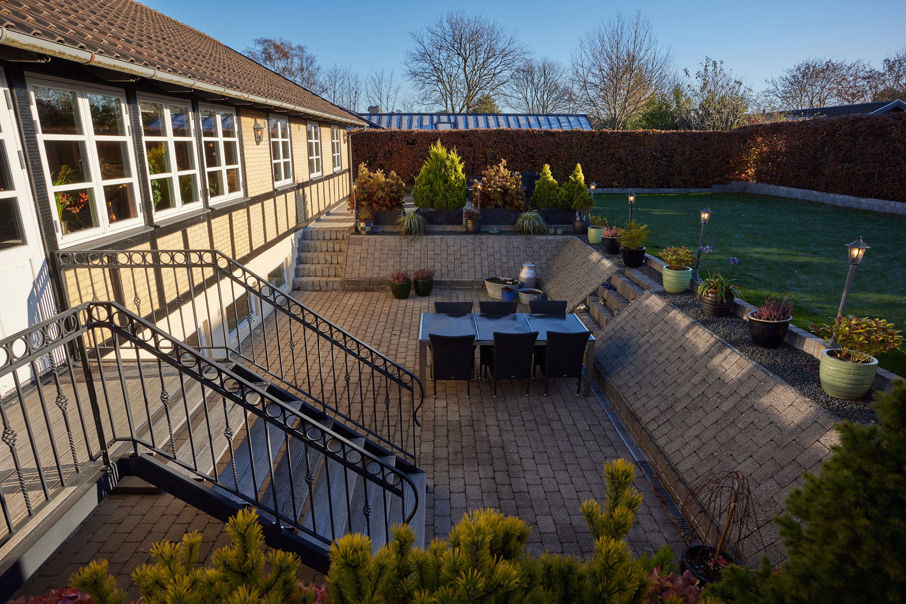 Fra stuen er der udgang til kæmpe sydvendt terrasse i 2 plan på 110 m2 og nem ugeneret have med græsplæne.