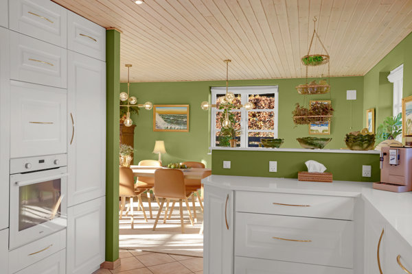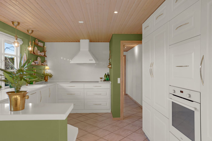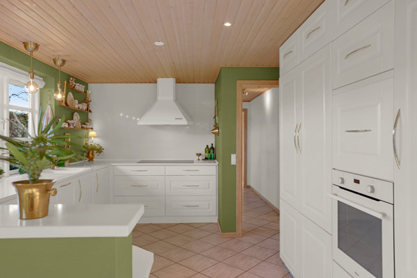 Stort og pænt køkken fra KVIK fra 2005 i åben forbindelse til vinkelstue med plads til langt spisebord og stor sofagruppe så hele familien kan samles.