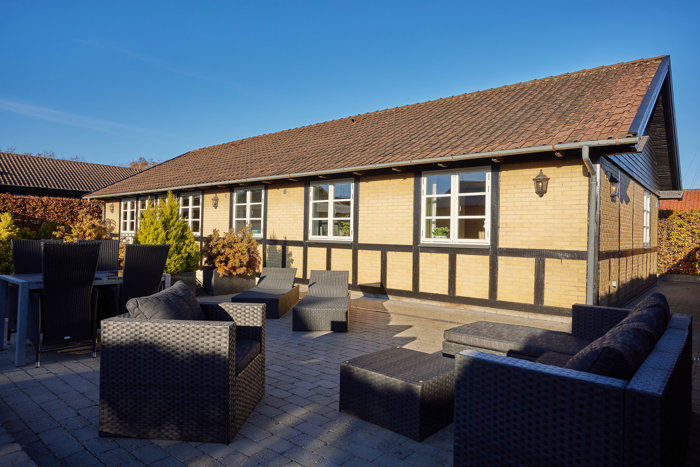 Huset er et unikt bindingsværks hus med gule mursten der er yderst velholdt.