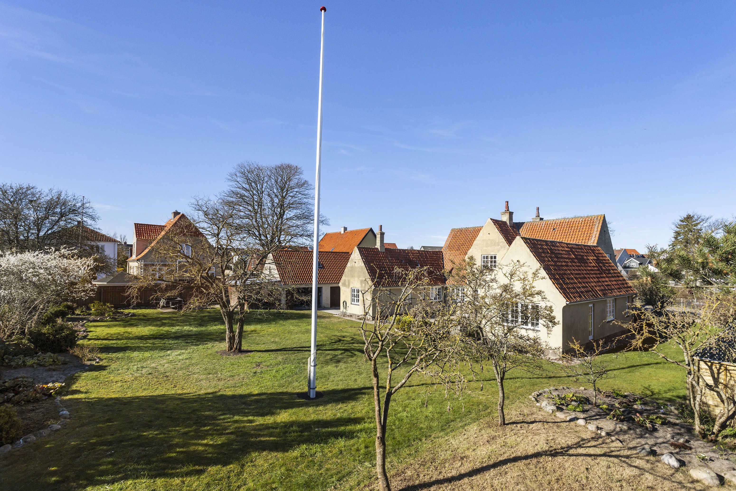 På en rolig og stemningsfuld adresse finder man denne markante og arkitektonisk smukke ejendom, hvor historie, håndværk og hjemlig varme smelter sammen i en sjælden helhed. Huset fremstår med en særlig karakter og en æstetik, der straks vækker opmærksomhed – fra de harmoniske proportioner og de klassiske sprossevinduer til den varme, pudsede facade og det levende tegltag.