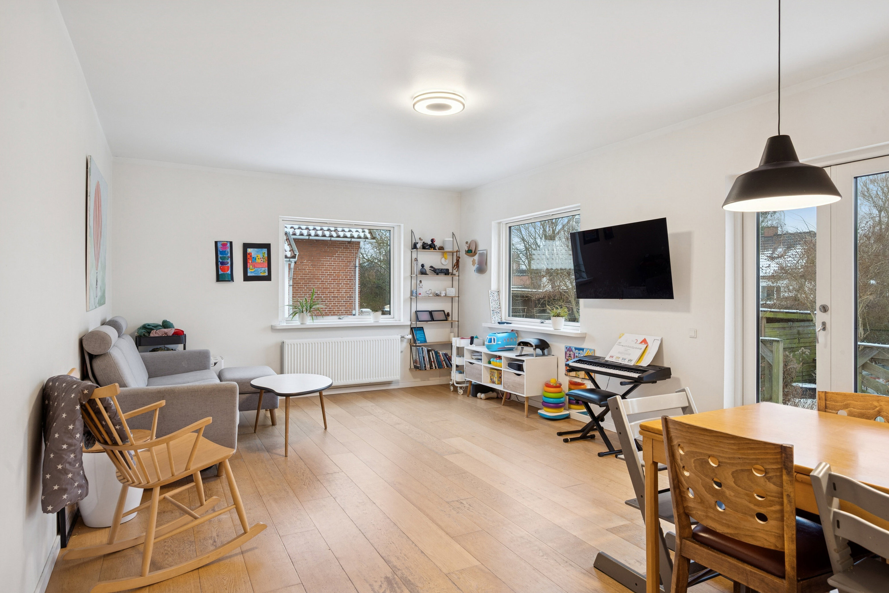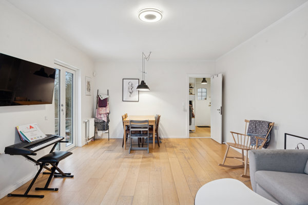Stuen er rummelig og let at møblere, og her er terrassedør samt et behageligt lysindfald fra syd og vest. Stuen flankeres af de to værelser, der begge er velproportionerede, og det ene har egen udgang til endnu en flot træterrasse.
