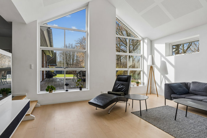 Boligens hjerte er det åbne og stilrene HTH-køkken, som ligger i forbindelse med bryggerset og videre åbner op til en hyggelig spisestue. Herfra fortsætter hjemmet naturligt ind i den skønne, lyse tv-stue i tilbygningen, hvor de store vinduespartier skaber en helt særlig atmosfære og et dejligt kig til haven.
