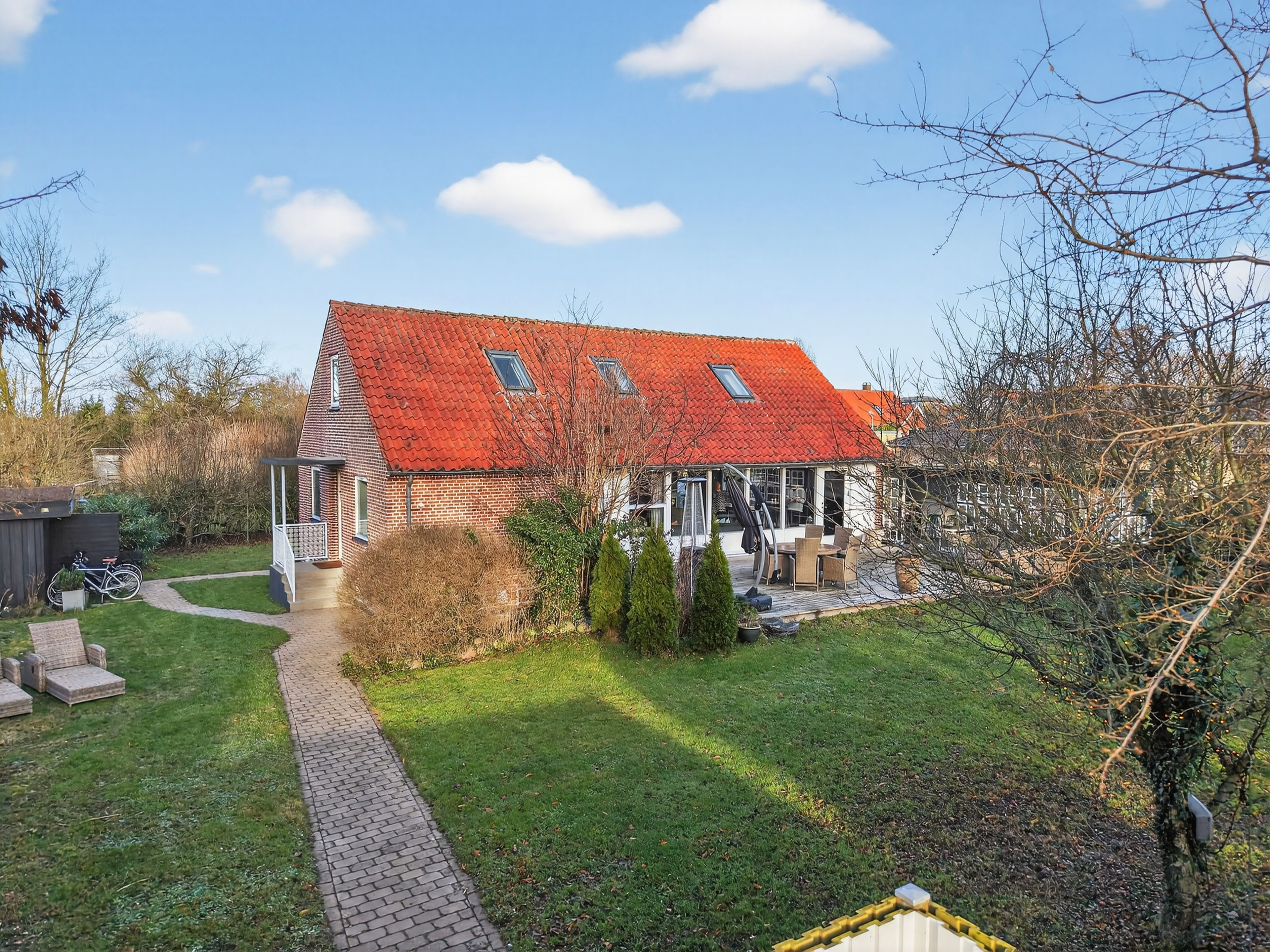 Hele 1.083 m2 er grunden på. Dels skaber det afstand til naboerne, og dels ligger huset behageligt tilbagetrukket fra vejen. Haven er syd/vest vendt, og solen er en naturlig følgesvend på den store træterrasse. I den ene ende sørger en hyggelig, lukket terrasse for, at I også kan nyde haven i skuldersæsonen. Den gemmer i øvrigt på et par gode udhuse, hvoraf det ene fra 2023 er i aldeles anvendelig kvalitet.