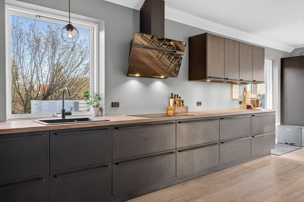 I 2022 blev stueplanet grundigt moderniseret – dog med undtagelse af det lækre badeværelse, som faktisk er fra 2025. En stor bruseniche med rainshower hører til de attraktive valg, og det afdæmpede inventar passer godt til boligens stemning. Det samme kan siges om det stilrene Vordingborg-køkken, hvor de sorte elementer er et roligt modspil til den lyse indretning. Køkkenet indgår i den store, åbne opholdsafdeling, som byder på flere udgange til haven. Afrundingsvis har man også forbedret villaen med skybrudssikring, nye fuger, og en fjernvarmeunit fra 2021.