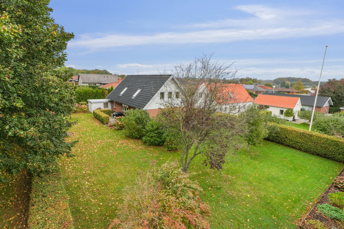 Grunden er dejligt stor, og haven prydes af frodig beplantning. På plænen er der fin plads til leg, og de forskellige fliseterrasser gør det muligt at nyde solen fra morgen til aften.