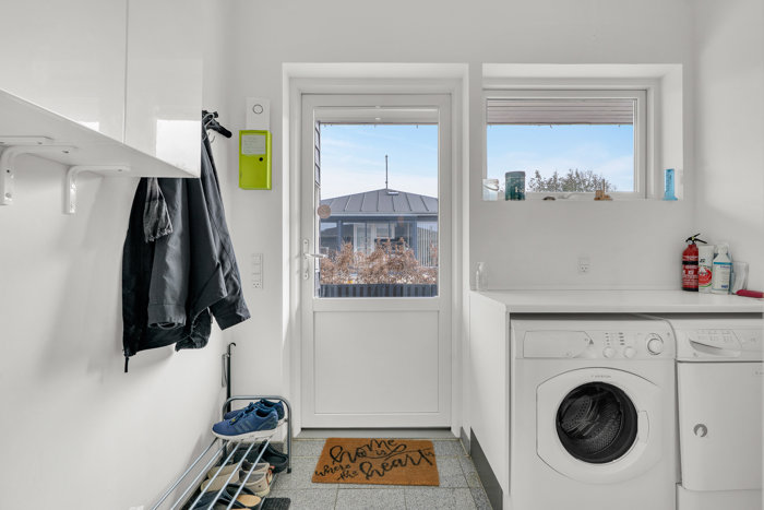Boligens hjerte er det åbne køkken, alrum og stuen, som skaber en rar og indbydende atmosfære. Derudover får du en funktionel entré/bryggers med både vaskemaskine og tørretumbler.