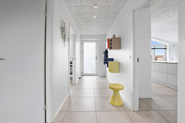 Entréen byder velkommen til boligen og har adgang til et separat bryggers, der er indrettet med fokus på familiens praktiske behov i hverdagen. Herfra er der direkte adgang til den dobbelte integrerede garage på hele 59 m² med gulvvarme, naturligvis udført i samme stilrene kvalitet og elegance som resten af boligen.