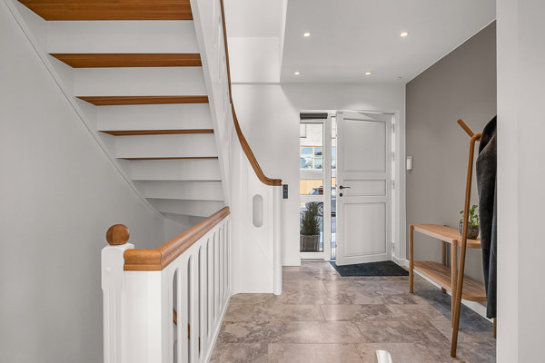 I oplever husets kvalitet og gennemførthed, lige fra I står i entréen. En smuk trappe i træ viser op på førstesalen, og som i resten af stueplan er her loftsspots og smukke gulvklinker.