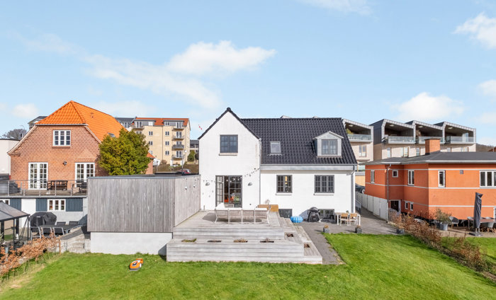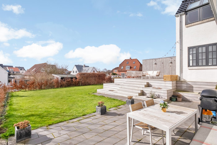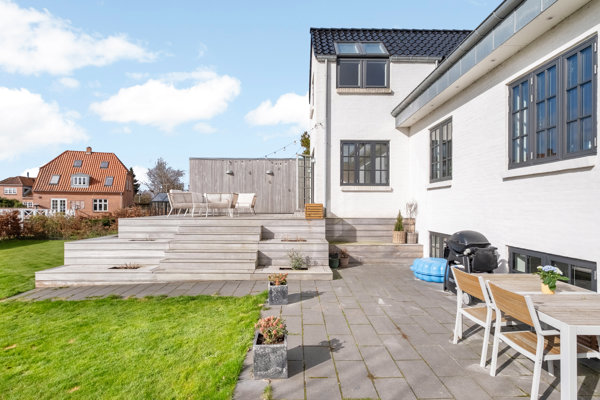 Oplevelsen af huset fuldendes, når du sidder på den hævede træterasse og nyder den lange udsigt over området. Terrassen ligger godt i læ op ad huset og garagen og fortsætter i plateauer ned mod haven.