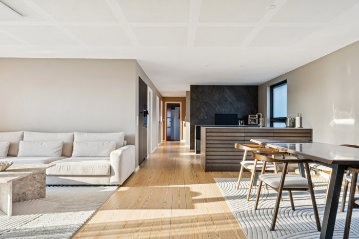 Særligt de massive pitch pine-planker i husets leverum stjæler hurtigt ens opmærksomhed. Indretningen