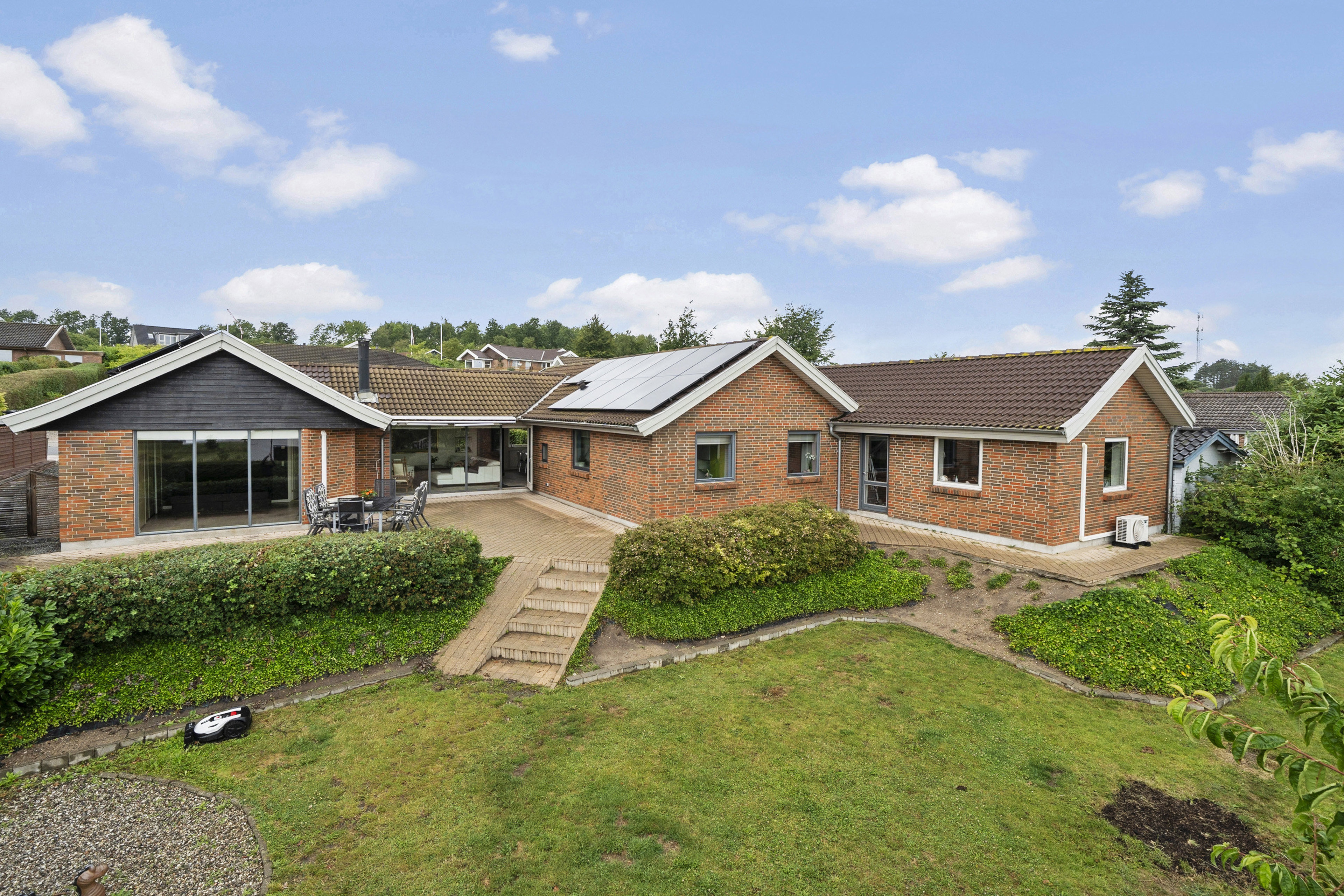 Boligen er beliggende på en let anlagt grund, hvor den store terrasse er centrum og et niveau ned af en lille trappe er der græs der indbyder til leg og udfoldelse.