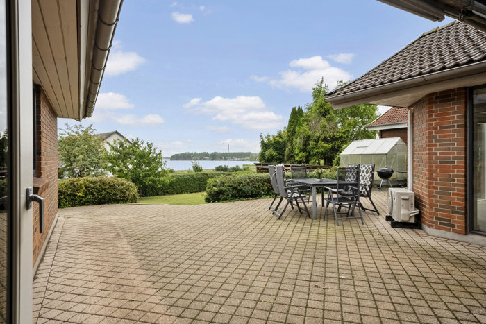 I alrummet kommer den smukke udsigt for alvor til sin ret, og boligens opholdsafdeling med den hyggelige brændeovn er indrettet med den i fokus, så den kan nydes mest muligt igennem de store vinduespartier, hvor der også er udgang til den fantastiske terrasse, hvor udsigten ligeledes kan nydes i fulde drag.
