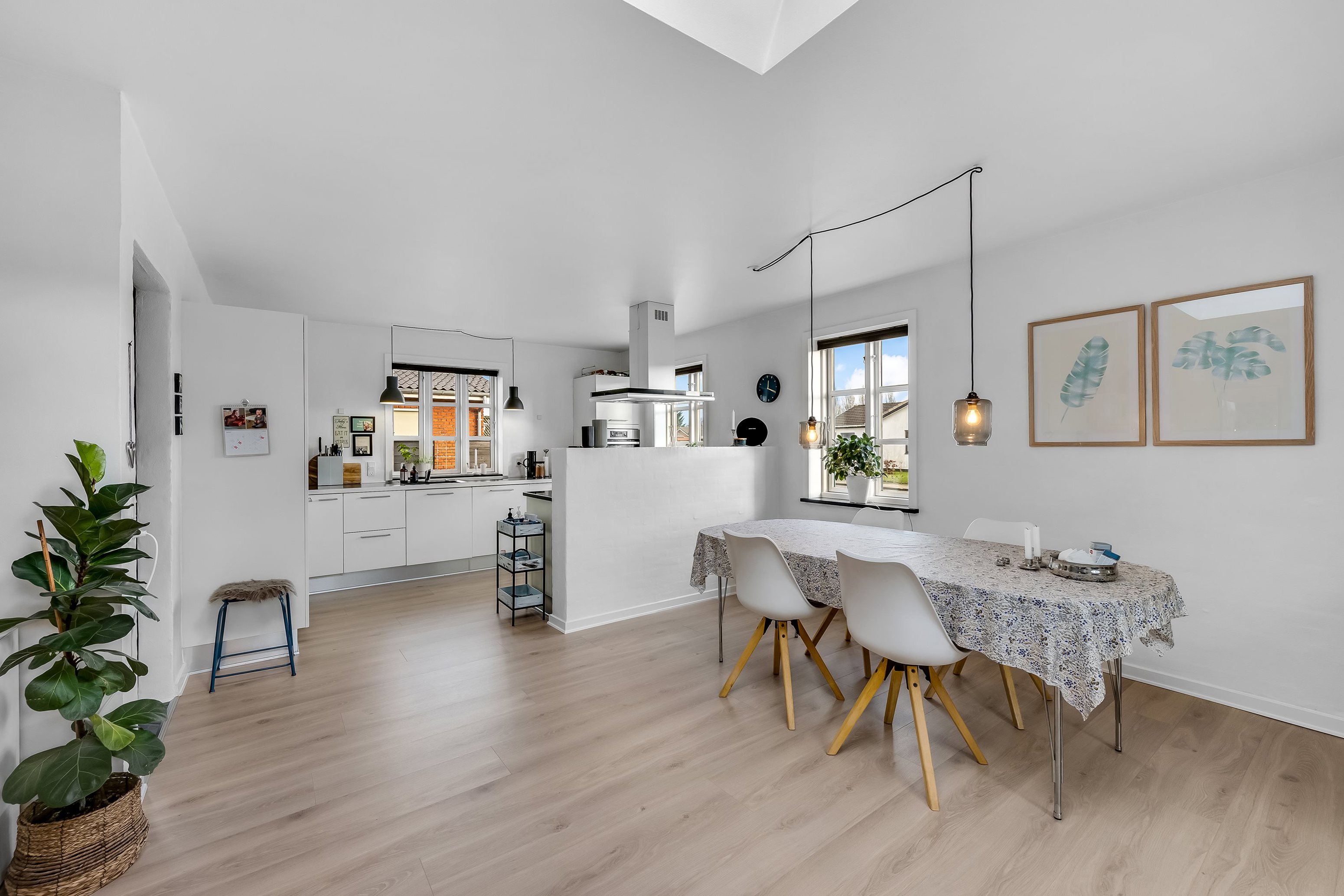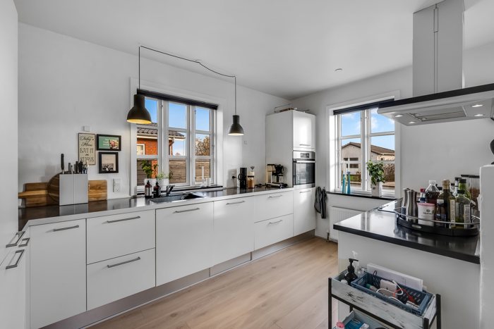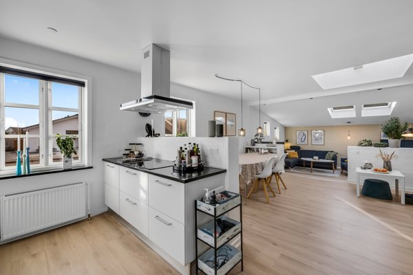 Villaen byder på en gennemtænkt planløsning og masser af naturligt lys. Der trædes ind i en lys og indbydende entre, hvorfra der er adgang til et stort og moderne køkken/alrum med stilrene materialer og flotte ovenlysvinduer, der skaber en fantastisk rumfornemmelse. Køkkenalrummet ligger i åben forbindelse med en hyggeligt, nedsænket stue - og herfra er der direkte udgang til en solrig terrasse og den nemme, grønne have.