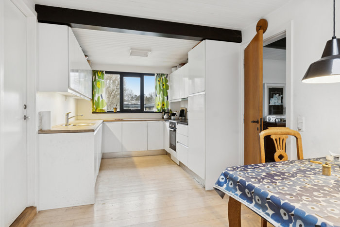 Allerede ved ankomsten understreges boligens stringente funkisudtryk med dobbeltgarage på 42 m², elegant integreret i huset og med god plads til både biler, værktøjet, cykler og hverdagsliv. Indenfor fortsætter den arkitektoniske helhed med smukke rumforløb og en helt særlig atriumstemning, hvor lys og udeliv bliver en naturlig del af boligen.