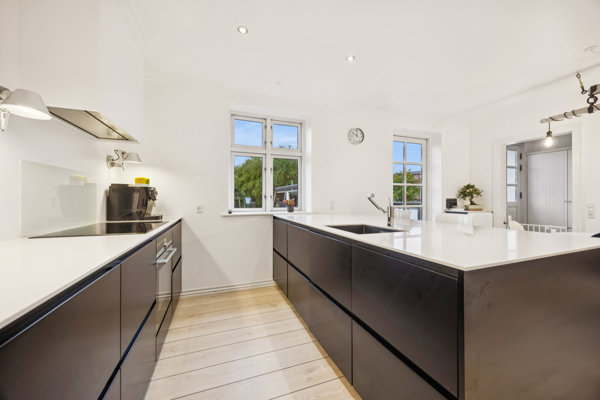 Indenfor bliver man mødt af et stilrent og tidssvarende køkken-alrum, som i dén grad er hjemmets hjerte. De moderne materialer og de store bordflader gør rummet både indbydende og funktionelt, og de mange vinduer lader dagslyset strømme ind med udsigt over haven.