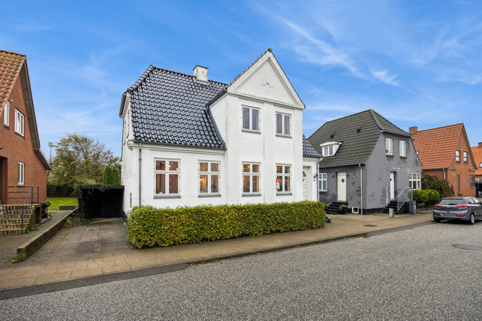 Allerede ved ankomsten fornemmer man husets karakter og gennemførte stil. Den hvidpudsede facade og det smukke tegltag står flot i det etablerede villakvarter, hvor nærheden til byen kombineres med fredelige omgivelser. Bag huset åbner der sig en stor, solrig og privat have, som strækker sig flot mod syd. Her er god plads til alt fra boldspil til afslapning, og den hævede terrasse fungerer som et naturligt samlingspunkt på varme dage. Til ejendommen hører ligeledes 2 carporte og stort udhus med plads til opbevaring eller værksted.