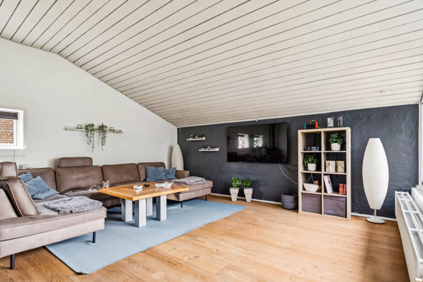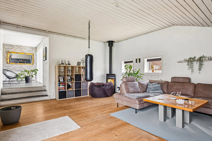 Villaen er lys, indbydende og lige til at flytte ind i. Hjemmets hjerte er det store, åbne køkken-alrum med ovenlysvinduer, der lader lyset strømme ind. Her er rigelig plads til madlavning, samvær og hyggelige aftener – og direkte udgang til den solrige terrasse og have. Stuen har loft til kip, som skaber en skøn rummelighed og en behagelig atmosfære.