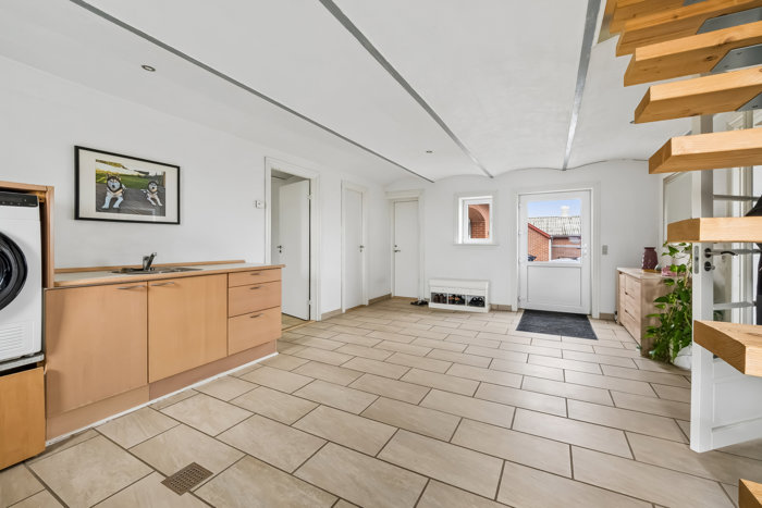 Stueplan byder på en stor og lys entré/bryggers, et flot og rummeligt badeværelse med bruseniche, samt et lyst og åbent køkken-alrum-stue med indbygget pejs. Køkken-alrummet fungerer som husets samlingspunkt med store vinduespartier, der giver et fantastisk lysindfald, og pejsen skaber hygge på kølige aftener. Som ekstra feature har nuværende ejer opsat en hjemmebiograf, der giver mulighed for gode filmoplevelser i hjemmet.